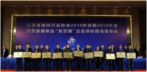 3月27日下午,江苏省建筑行业协会2019年会暨2018年度江苏省建筑业“双百强”企业评价排名发布会,在江苏著名建筑之乡海门隆重召开。江苏省建筑行业协会会长张宁宁、江苏省住建厅副厅长赵庆红、江苏省海门市市长郭晓敏、南通市住建局副局长沈卫星、江苏省住建厅建筑市场监管处处长李震、工程质量安全监管处处长汪志强、省住建行业党委副书记曹云华和省建筑行业协会部分副会长、秘书长、监事出席会议,获评“双百强”和“三优”(优秀企业、优秀企业家、优秀企业经理)殊荣的500多位江苏省建筑业龙头、骨干企业的代表出席会议。