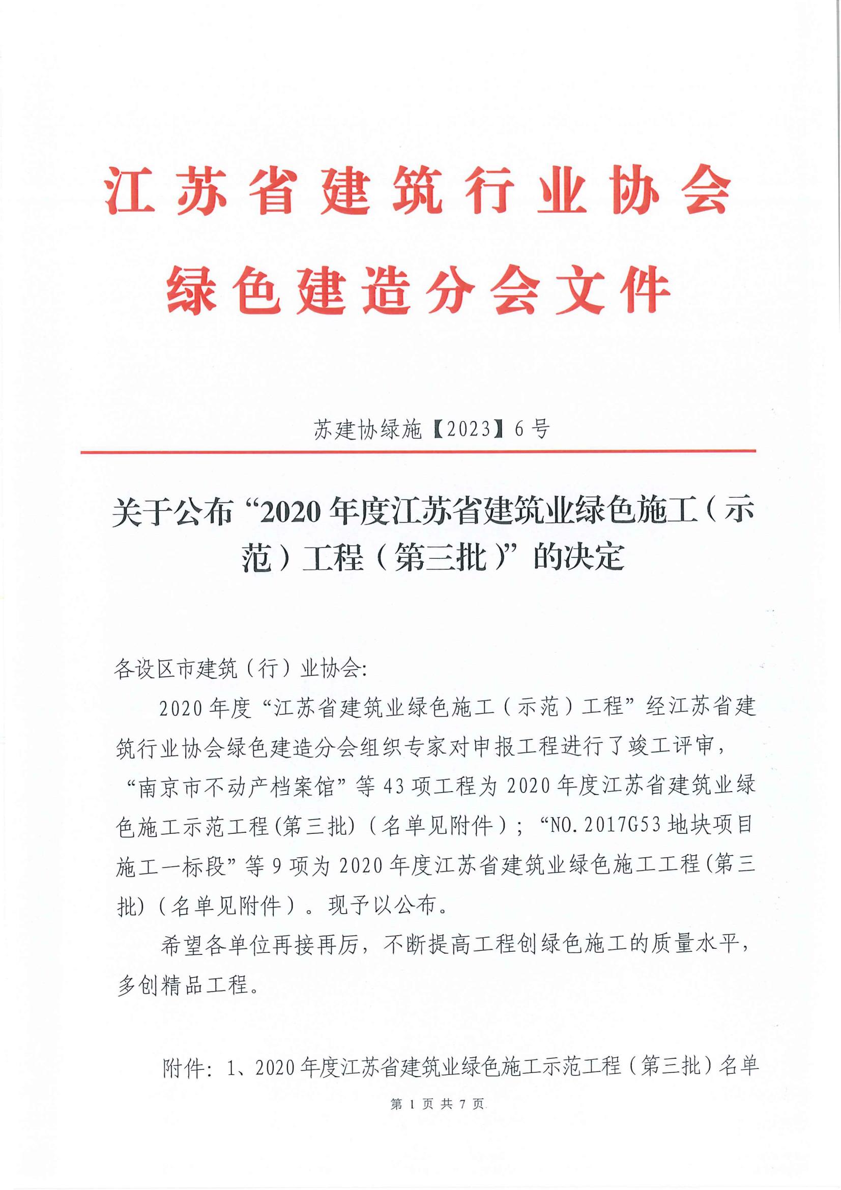 关于公布“2020年度江苏省建筑业绿色施工(示范)工程(第三批)”的决定