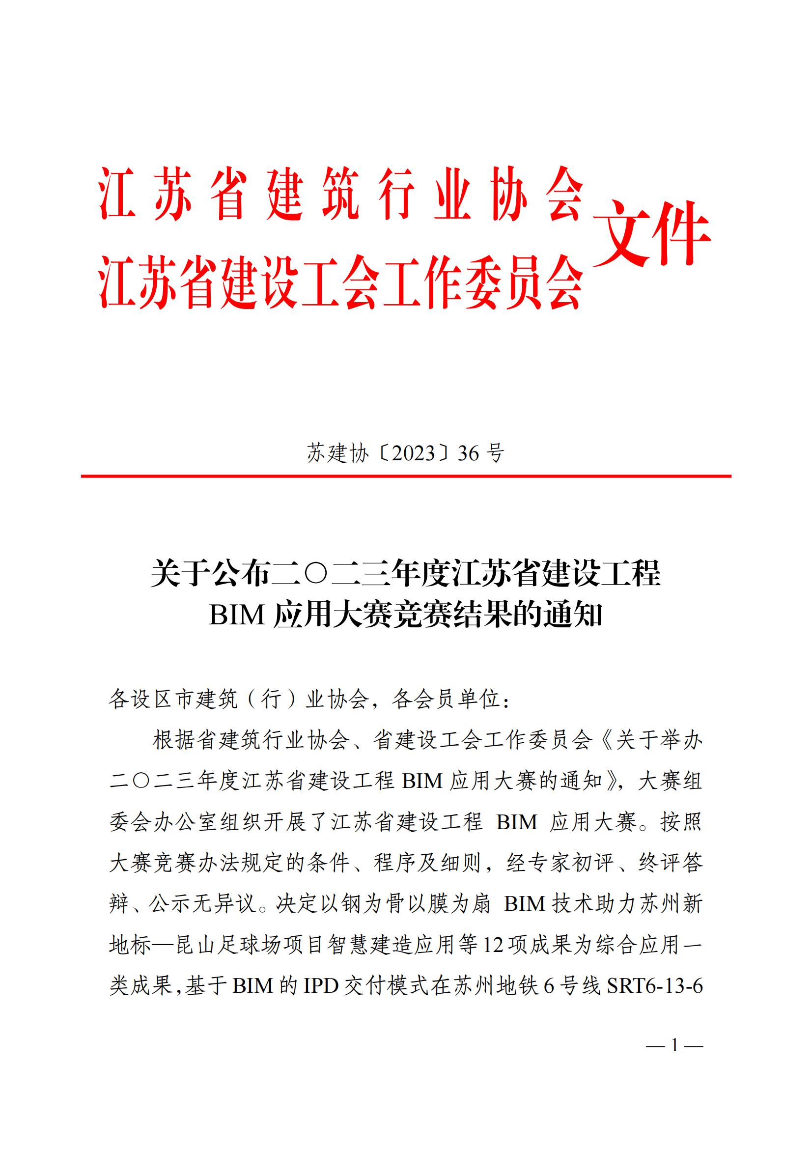附件:1、二○二三年度江苏省建设工程 BIM 应用大赛竞赛结果名单(BIM 技术综合应用)